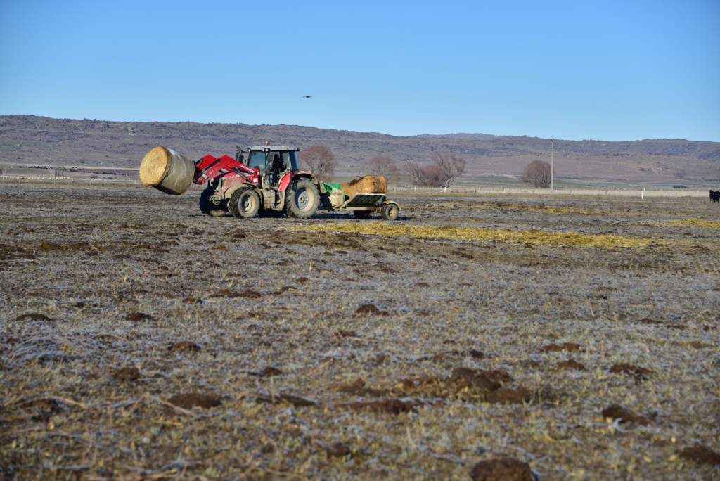 Russell and Gary welcome us in Moa Creek, where they feed 1500-2000 bales between their family farm and a lease block. Their first Hustler bale feeder is still in operation after 23 years of service and according to Russell, “there only was the odd hick-up, mostly due to human error.” So they were happy to choose another Hustler bale processor when increasing the size of their operation, this time the latest generation Chainless TX205.