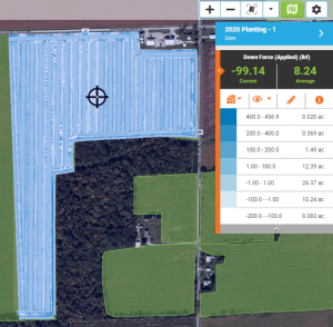 Next, let’s take a look at other areas of the field that didn’t require as much force to achieve depth. In those areas, the factory spring system was still applying 300 lbs. downforce, while the SureForce system had automatically reduced the downforce to 100 lbs.