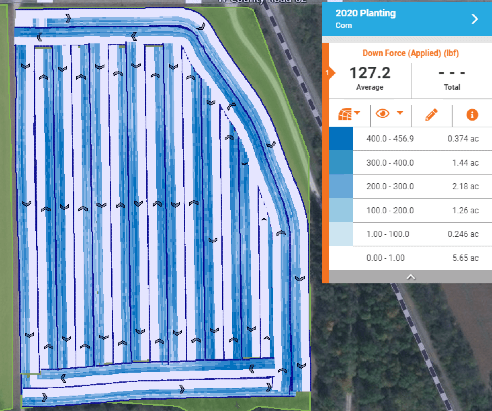 Next, this planter moves to a conventionally tilled field (Fig. 4) to continue planting. The factory springs are left at a heavy setting. Since the SureForce system automatically adjusts itself to current ground conditions, we see a stark difference in applied downforce. Within this field, SureForce values range from 200 lbs. of uplift on the row-unit to 400 lbs. of downforce. That is a 600 lb. range across this field.