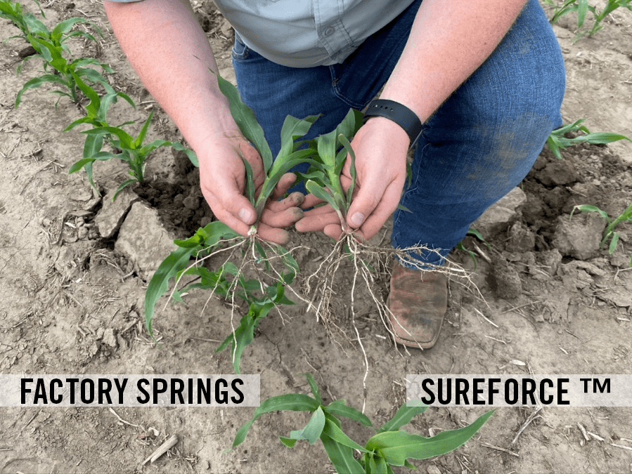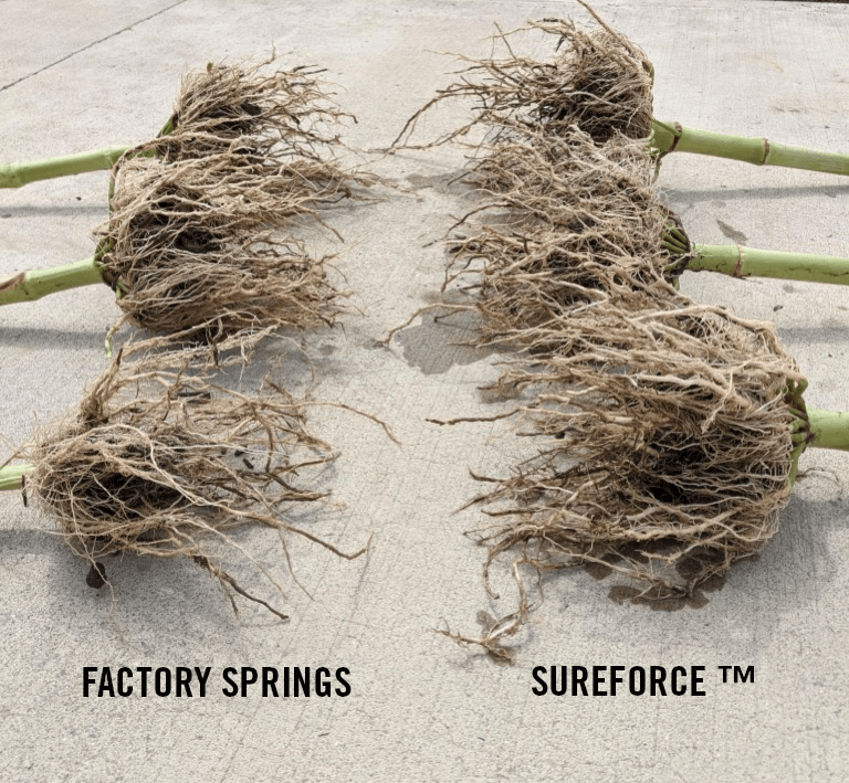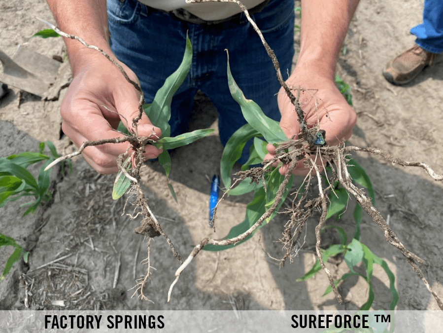In Figures 6 and 7 above, it is obvious the rows equipped with SureForce provided the best root development. In every case, SureForce provided: