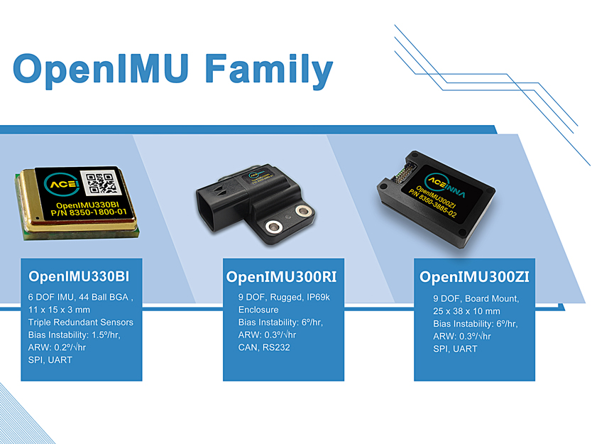 The new ROS Driver currently works with the Aceinna’s versatile OpenIMU family, which includes the OpenIMU300ZI, OpenIMU300RI, and OpenIMU330BI. Each sensor has its own distinct hardware features, allowing the user several options for their unique application. The open-source nature of this architecture makes each device highly configurable as well. Aceinna’s OpenIMU’s have several software applications available, with source code available via Github and the Aceinna Extension on Microsoft Visual Studio Code. Software applications include IMU, VG-AHRS, and INS.