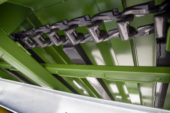 In order to be able to fulfill the wishes of all customers, Fliegl now offers its KDS not only the tried and tested push-off technology but also a scraper floor as the feeding technology. It consists of two chains with 140 chain links each. Each individual chain link has a breaking load of 50 t. The chains connect 41 continuously closed scraper floor strips. The scraper floor is driven hydraulically via a side gear and the speed can be continuously adjusted. If the chains lose their tension over time, a mechanical or optionally hydraulic chain tensioner ensures easy maintenance.