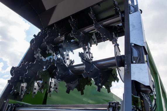 Right after the feed control gate are two horizontal spreader rollers with a diameter of 770 mm, each. These ensure optimal mixing, loosening, and dosing of the spreading material. Easy maintenance is guaranteed by exchangeable blades. If something should spread inside, the system automatically switches off thanks to electronic speed monitoring when the roller speed is reduced.