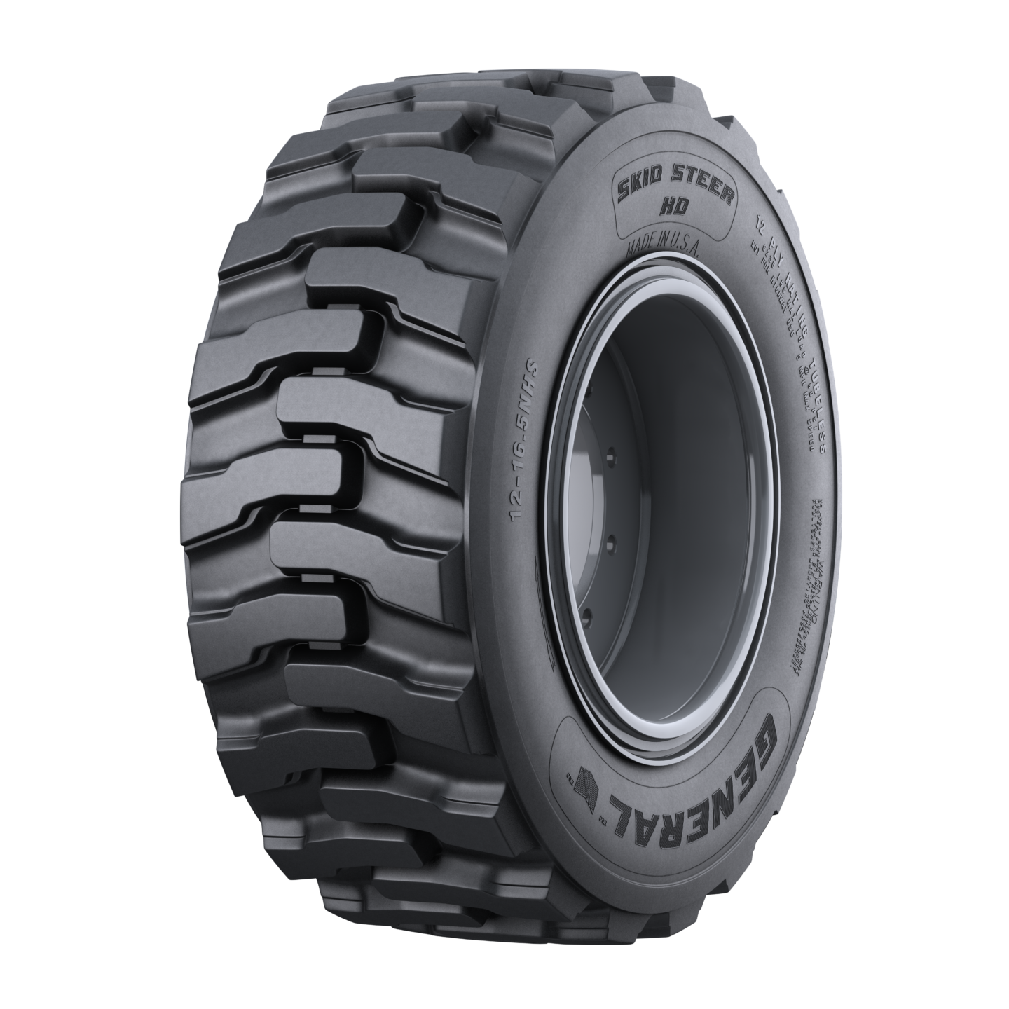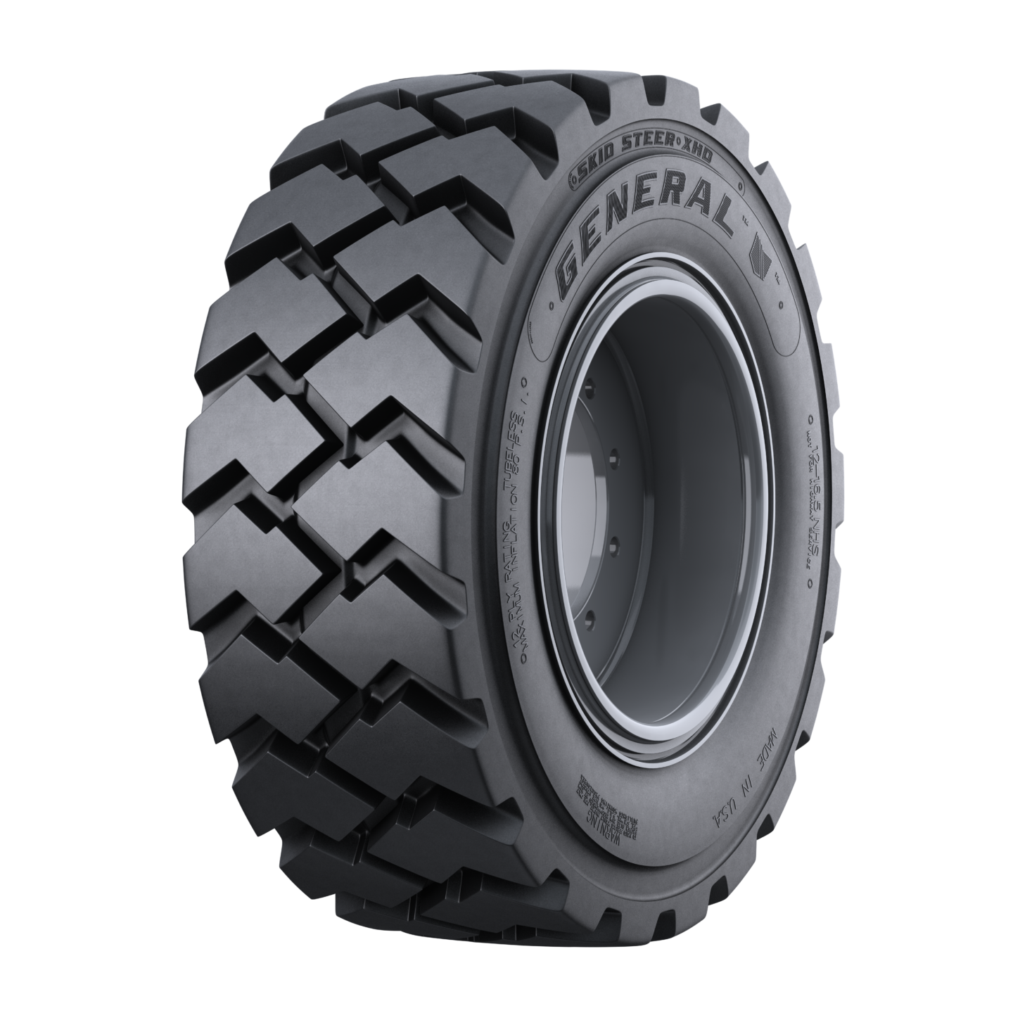 - General Skid Steer HD: A heavy-duty tire with a deep staggered tread bar design for excellent traction and grip.