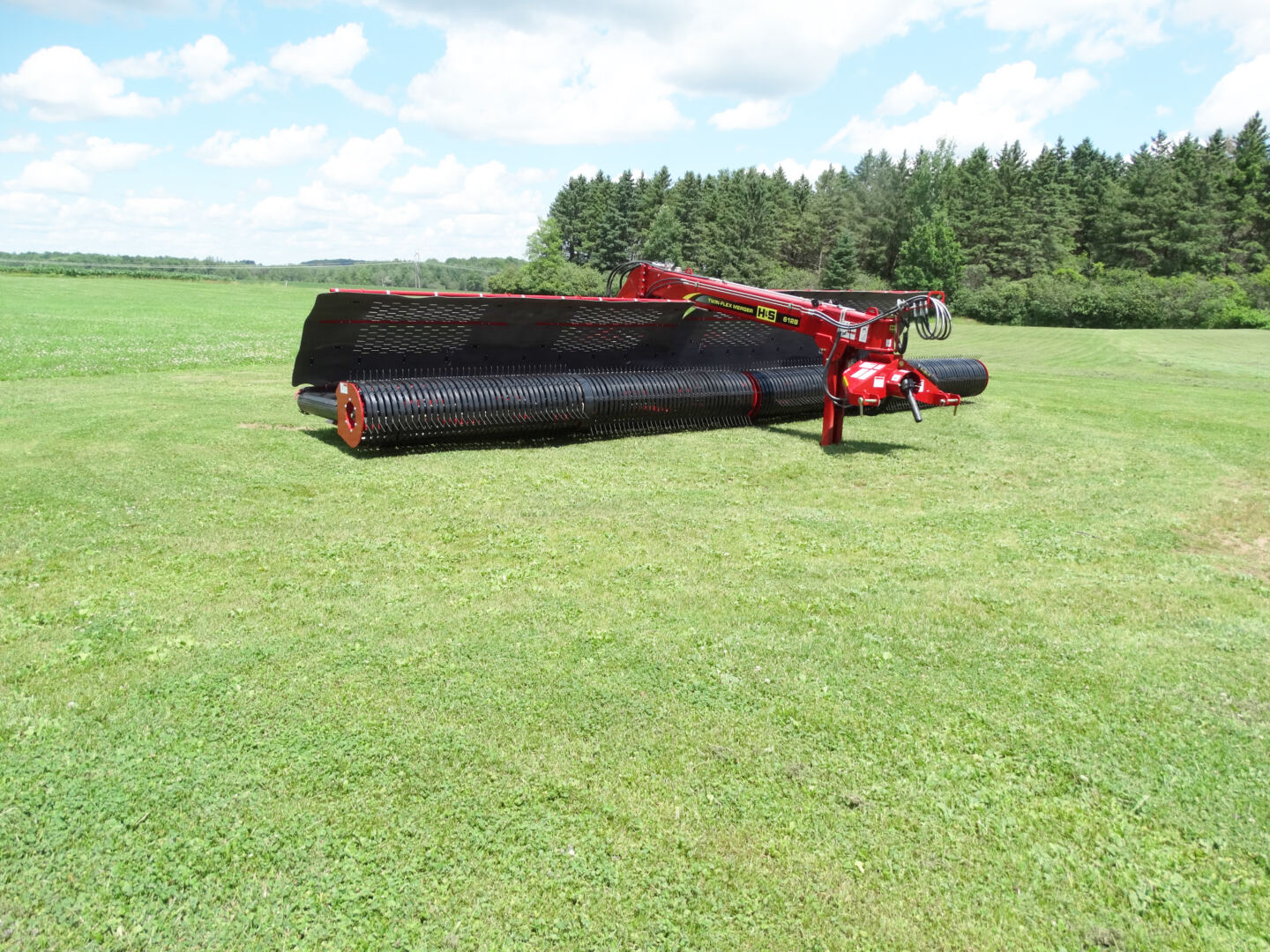 The model 6128 features the Exclusive “Soft ShoeSuspension Technology System with In-Cab-Adjust, and both models feature the Industries Largest Hydraulic Adjust Skid Pads. The Elliptical Shape Skid Pads ride on the back of the pad and decrease damage to the field. The 42” Cross Conveyor is also the widest in its’ class and moves the crop easily for smooth, even windrows.