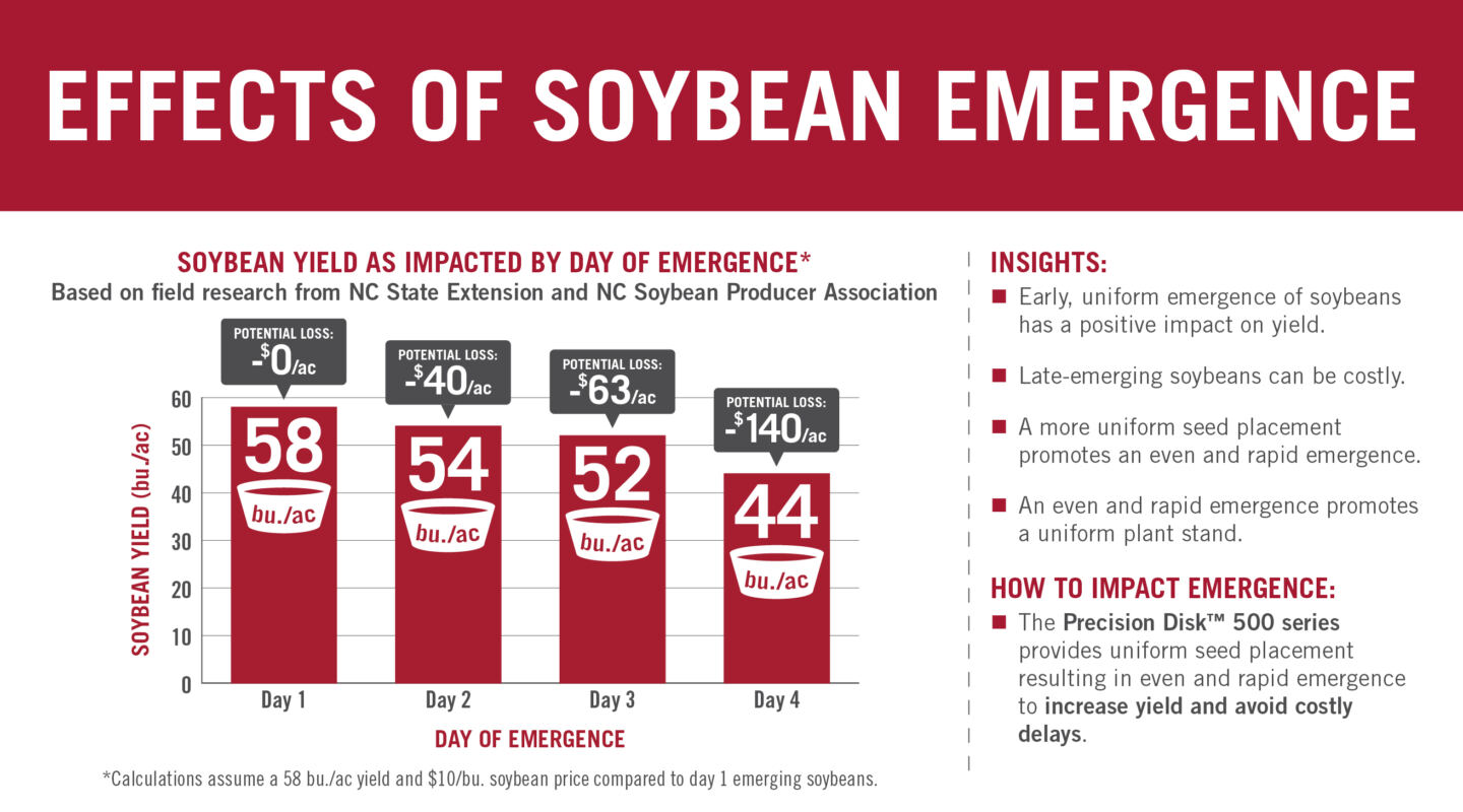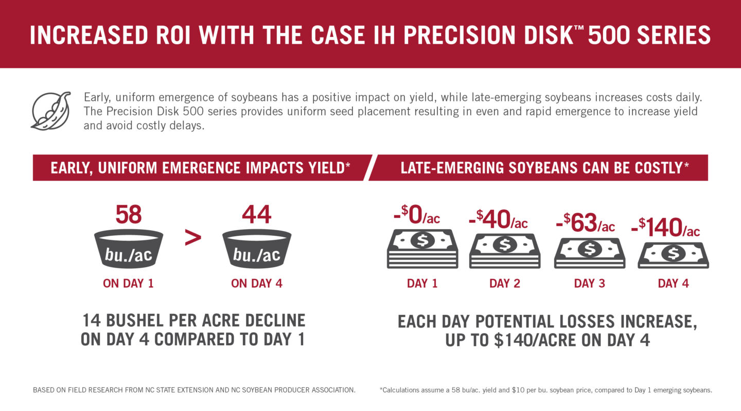 In addition to earlier planting, key drivers to soybean yields that producers have control over are accurate seed placement and consistent emergence. Studies from North Carolina State University and the North Carolina Soybean Producers Association show that late-emerging soybeans can be costly — with a potential loss of up to $140 per acre when soybeans are just four days behind. Case IH Precision Disk 500T single disk, single-rank air drills are designed to deliver the most accurate seed placement in the industry, allowing growers to set up their soybean crop for success and help plants emerge earlier and more consistently to boost yields.