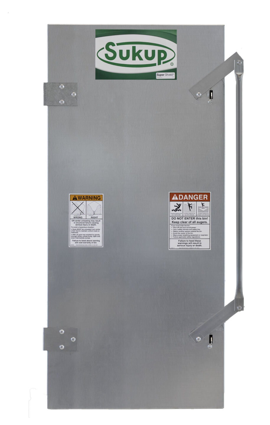 Inner panels of Sukup’s 44” and 66” tall doors, both of which use the new safety hardware, provide structural support to grain bins.