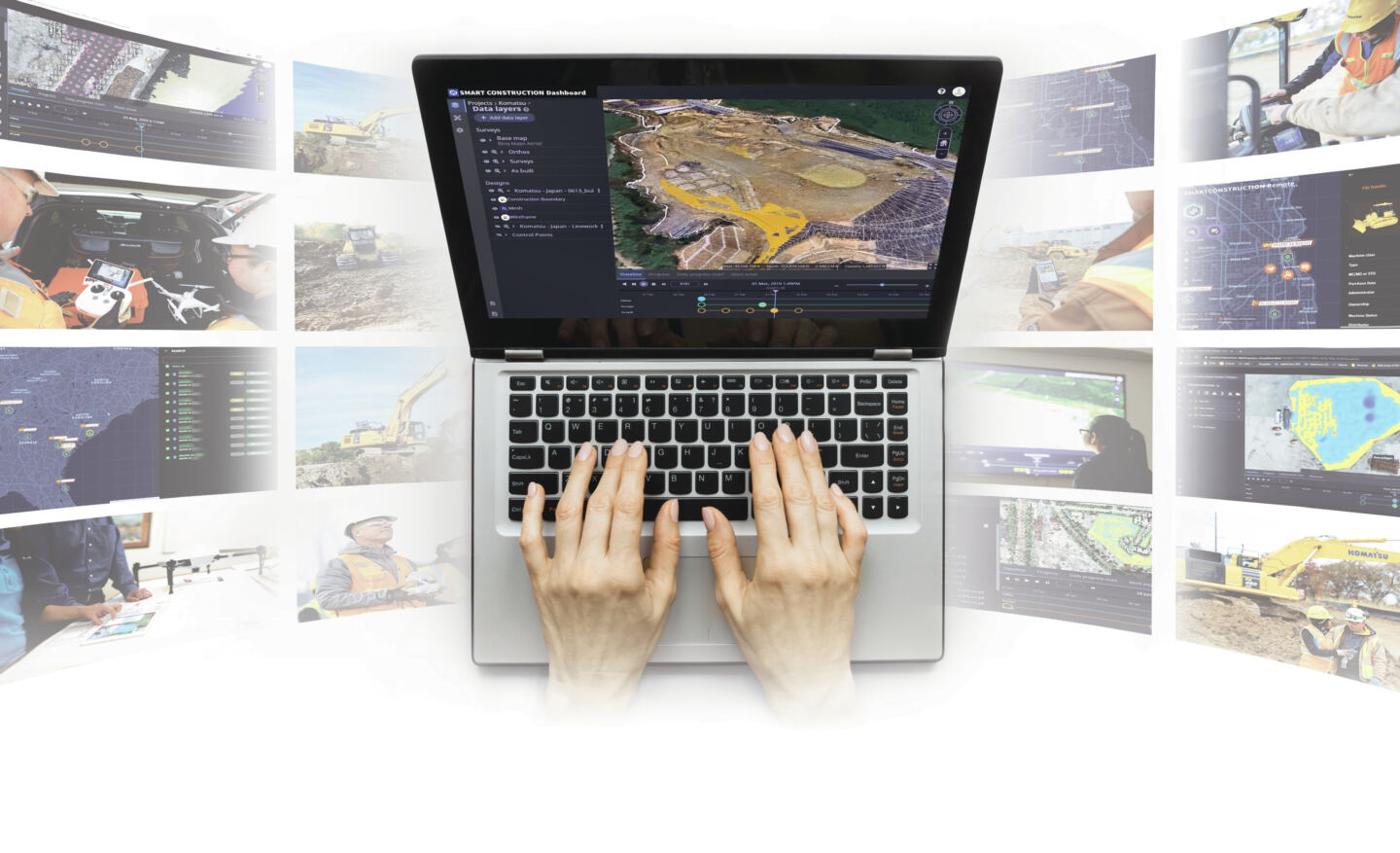 Smart Construction Dashboard is designed to be used daily and combines data from multiple sources into one comprehensive picture. Smart Construction Dashboard provides contractors with 3D graphic visualization of all design, drone, and machine data to measure cut/fills, quantities, and productivity. Site progress can be viewed with timeline functions (including playback) in terms of whole-site visuals, cross-sections, and individual measurements.