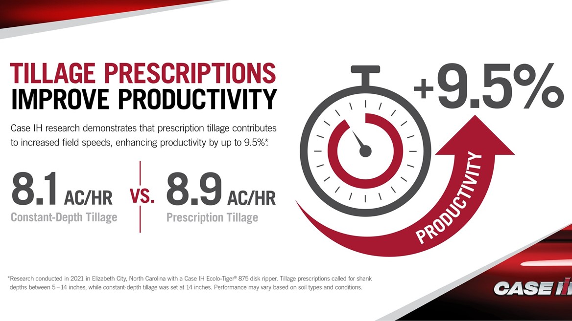 In Case IH research with the Ecolo-Tiger 875 disk ripper, prescriptions developed based on soil type and conditions contributed to more efficient fuel economy and usage, compared with constant-depth tillage. With increased field speeds, tillage prescriptions helped enhance productivity by up to 9.5%.