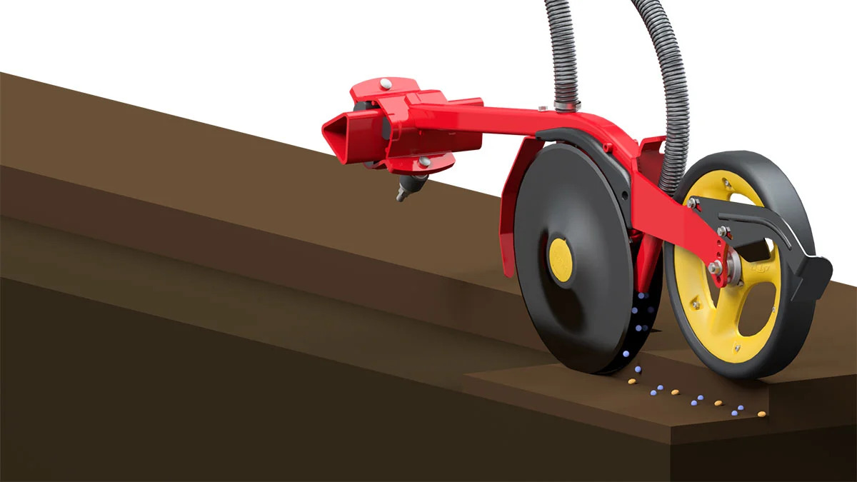The fertilizer is metered with the Fenix electric metering system, this is the same unit used for the seed metering. It is both highly precise and non-corrosive. Split cells in the rotor and an angled exit from the metering unit efficiently prevents any pulsing, ensuring that all plants will have the exact same access to fertilizer.