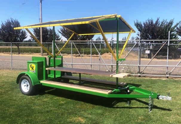 GK Shade Trailers are in compliance with new Oregon workplace regulations for extreme heat. The trailers offer excellent worker protection for the prevention of heat illness and stress. The folding shade top collapses for transport to travel from location to location. The deluxe trailer provides seating for up to 8 people, has a built-in garbage can, wood decking, and standard 2” ball hitch. It also includes space for coolers to provide plenty of water for outdoor and field workers.