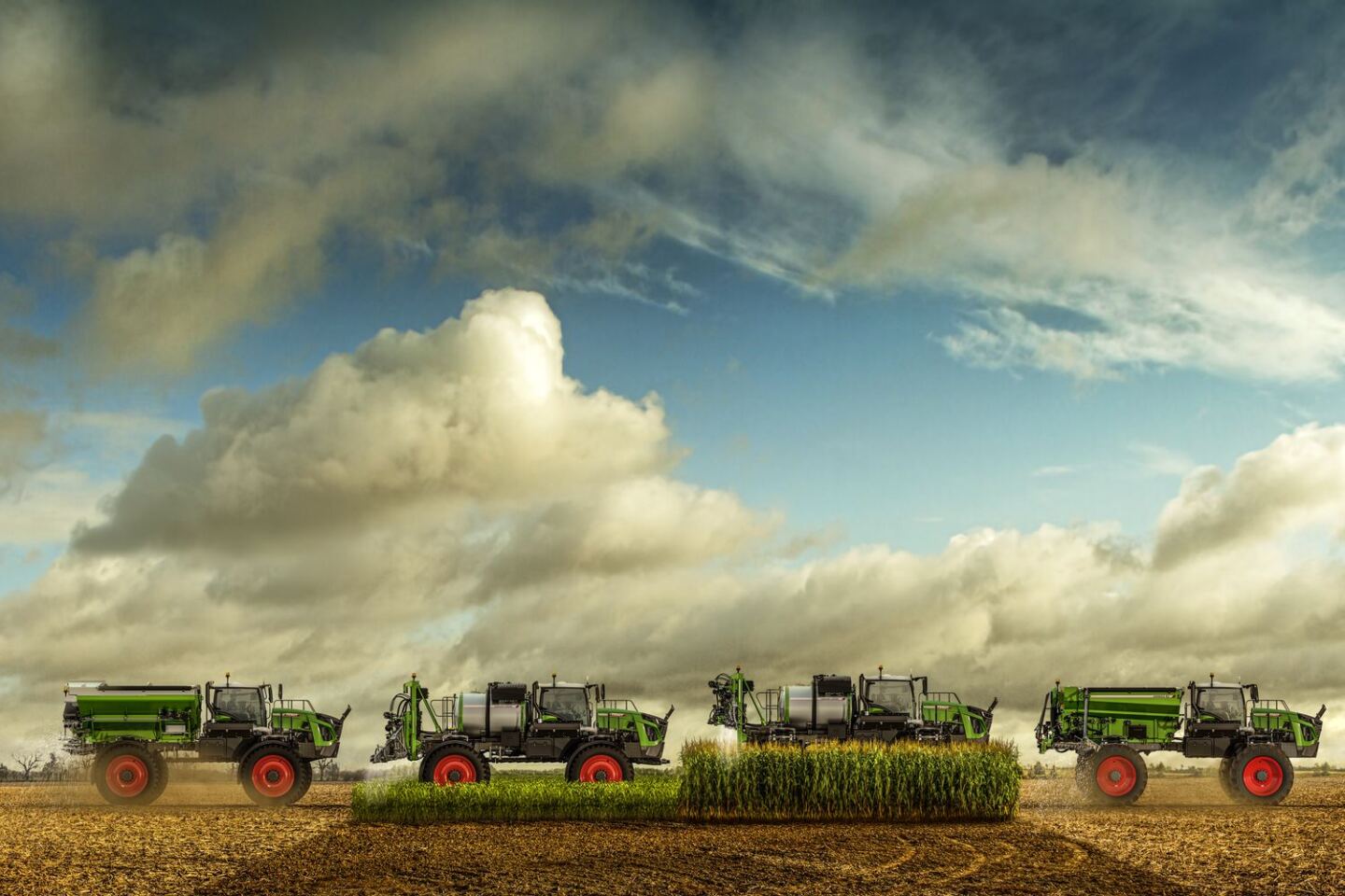 The Fendt Rogator 900 Series Applicator is a self-propelled, rear-mounted-boom applicator with dual-position, adjustable crop clearance for use from pre-plant to tall crops. The machine adjusts between standard (56-60”) and high clearance (72-76”) in less than 45 seconds with the push of a button.