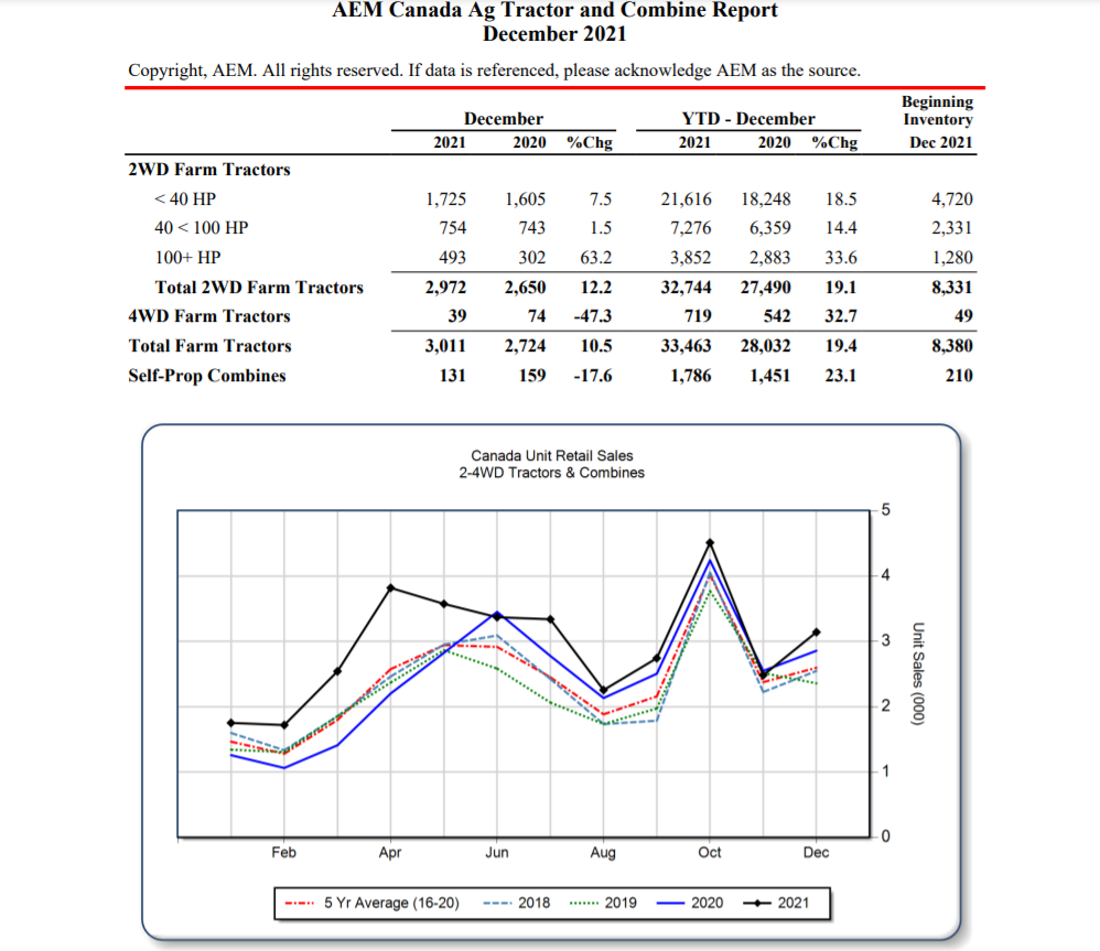 “Seeing gains in the double digits across North America year-over-year for both tractors and combines is great for equipment manufacturers. Sales gains over an already-successful 2020 came despite the supply chain issues and workforce challenges that made 2021 a challenging year for manufacturers. Our industry is working hard to navigate these supply chain challenges to deliver equipment and parts to farmers as they approach the 2022 growing season,”