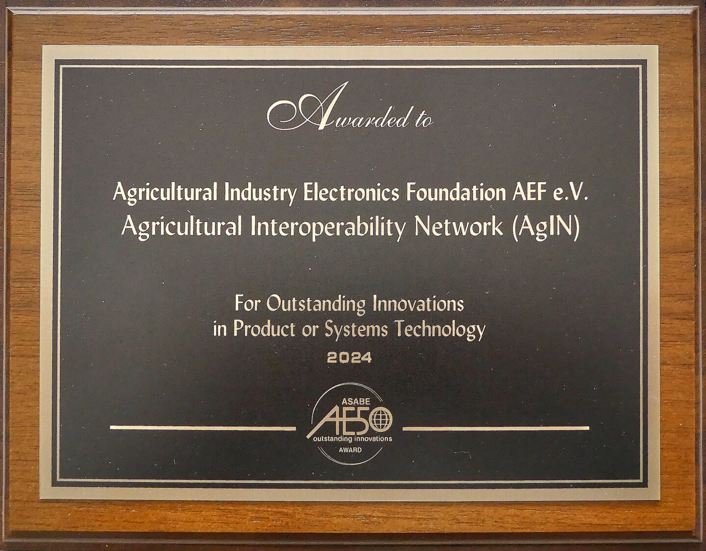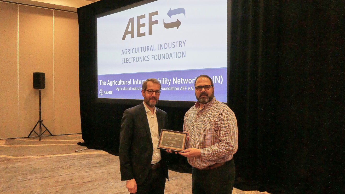 The Agricultural Industry Electronics Foundation (AEF), a global non-profit organization founded to improve cross-manufacturer compatibility in agricultural equipment, was recognized by the ASABE with a prestigious AE50 award for its Agricultural Interoperability Network (AgIN).